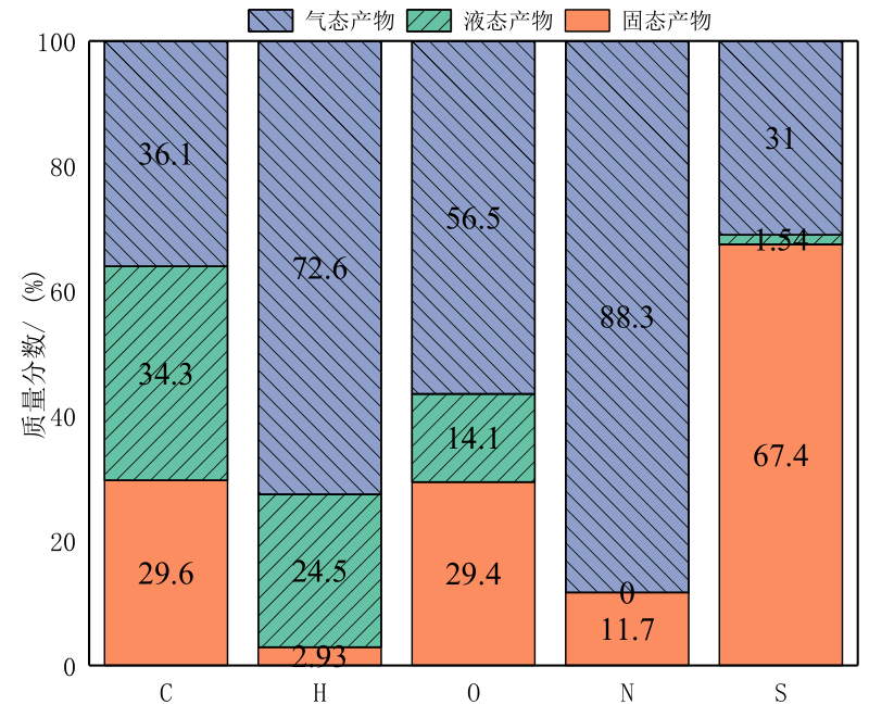機油的加入對三相產物的元素分布產生了較大的影響。C元素在固態產物中的比例一直降低,從39.6%降低到20.2%,這一方面是由于炭黑的產率一直在降低,另一方面則是炭黑中的C元素含量降低。而裂解油和熱解氣的比例則在提高,這表明隨著機油的加入,C元素整體上從固態產物向裂解油和熱解氣轉移。機油的加入使得熱解炭黑的H元素進一步從6.42%減少到2.81%,裂解油中的H元素則從62.4%降低到34.4%,而熱解氣中的H元素則從31.2%上升到62.8%,這表明隨著機油的加入,H元素主要從裂解油向熱解氣中轉移。O元素并不具有可燃性,但裂解油中的O元素質量分數一直在升高,熱解氣中的O元素先升高后降低到與未添加機油時一致,而熱解炭黑中的O元素則一直從48.7%降低到28.4%,這說明機油加入后,O元素整體上是從熱解炭黑向裂解油中遷移。機油添加后,裂解油中仍然沒有N元素,這對裂解油來說是一個好消息,但熱解氣中的N元素含量明顯上升,從78.8%上升到92.6%,這對熱解氣來說不是一個好消息。這一是由于機油中的N含量本來就比較高,二是由于機油的加入促進了炭黑中N化物的釋放,更多的N化物以氣態氧化物的形式存在于氣態產物中。熱解炭黑中的N元素質量分數則一直在降低,這對熱解炭黑來說也不是一個好消息,因為炭黑中摻雜的N原子可以提高炭黑的吸附性能,炭黑中N元素的質量分數降低則意味著炭黑的吸附性能會大打折扣。機油的加入使得N元素從炭黑中進一步遷移到氣態產物中,但這個方向并不是我們希望看到的。對于S元素而言,三相產物中的S元素分布雖然都有變化但變化幅度較小,整體上看主要是從氣態產物向固態產物中遷移。